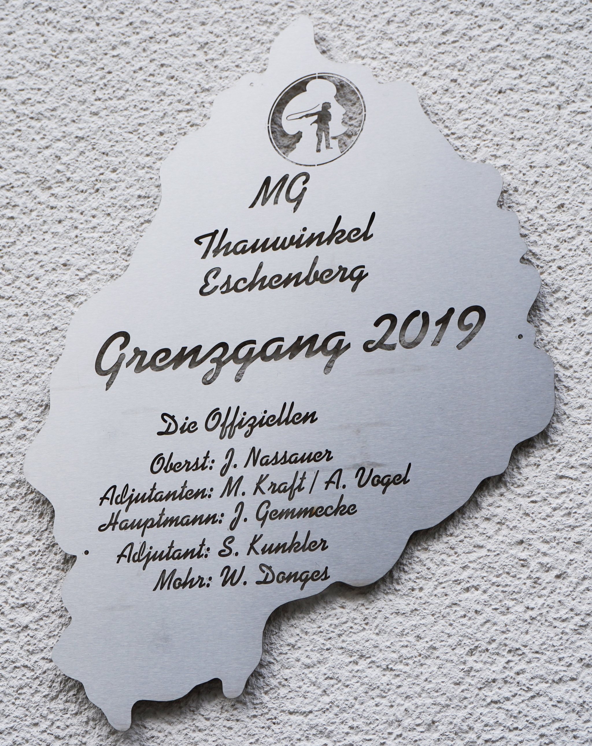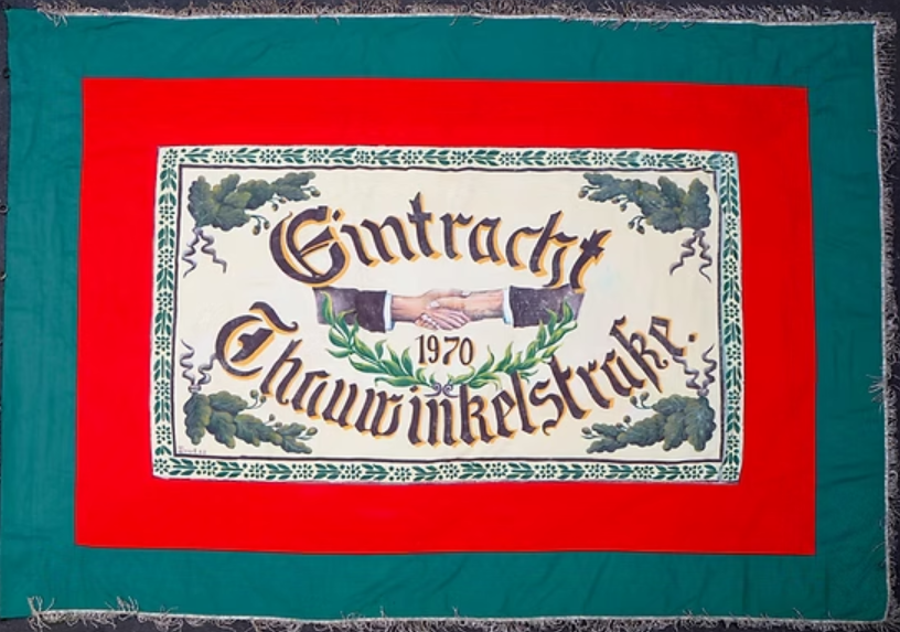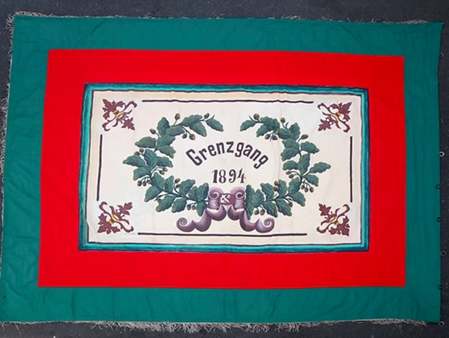 [Text: Uwe Funk]: Nachdem beim Grenzgang in Biedenkopf im Jahr 1886 die Thauwinkelstraße und die Kottenbachstraße als gemeinsame Männergesellschaft aufgetreten waren, trennten sie sich in den kommenden Jahren und gründeten beim Grenzgang 1894 in jeder Straße eine eigene Gesellschaft. Die Gründe der Trennung sind nicht mehr bekannt. Ab dem Grenzgang 1894 trat die Thauwinkelstraße als eigene Gesellschaft unter dem Namen "Eintracht Thauwinkel" auf und schaffte eine Fahne an. Später, als der Eschenberg bebaut wurde und die dort wohnenden Bürger mit in die Gesellschaft einbezogen wurden, nannte man sich Männergesellschaft Thauwinkel-Eschenberg.